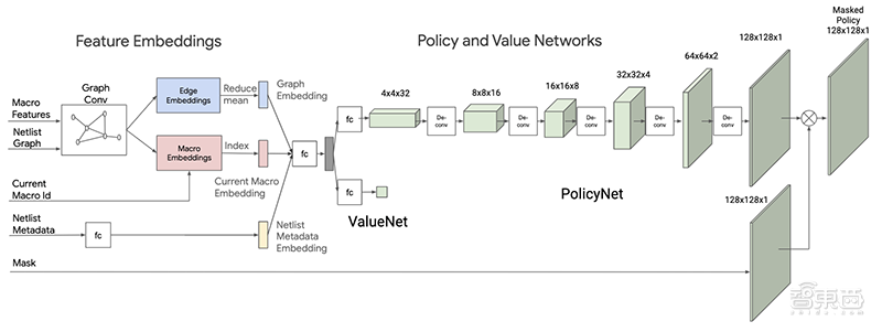 嵌入层对当前给定网表要放置的邻接、节点特性、宏信息进行编码,然后策略网络输出可用放置位置上的概率分布,而价值网络则输出当前放置位置的预期奖励估值。