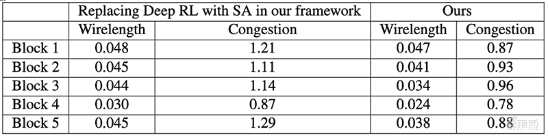研究人员进行多次模拟退火实验,结果显示,模拟退火算法很难产生高质量的芯片布局,较谷歌新方法平均线长增加14.4%,拥塞率增加24.1%。