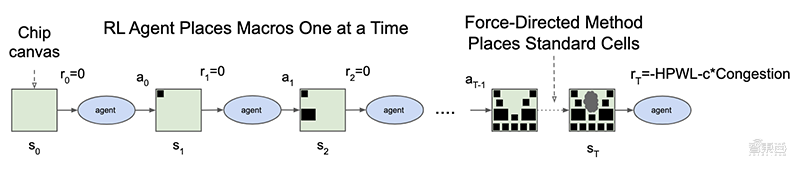 智能体在每个步骤中布局一个宏,一旦布局了所有宏,标准单元格就会使用强制定向的方法来放置。奖励是近似的线路长度和拥塞的线性组合,被计算并传递给代理来优化它的参数,以便下一次迭代。