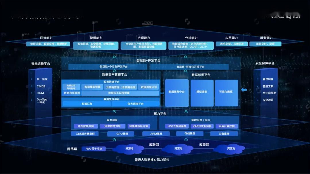 中国联通自2012年起率先对全国31省市区的数据进行集中统一运营,并成立专业子公司——联通大数据有限公司。历经几年沉淀,联通大数据研发了“智慧数开发平台、数据资产管理平台、数据科学研发平台、算力平台、智能运维平台以及安全保障平台”六大平台,积累了“联接能力、管理能力、治理能力、分析能力、应用能力、服务能力”六项大数据能力,为政府、金融、文旅交航、商企等行业的客户提供数字化转型产品和服务。