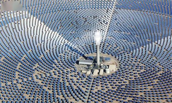 CSP 技术展示图,所有的日光反射装置共同把光线聚集在中心点