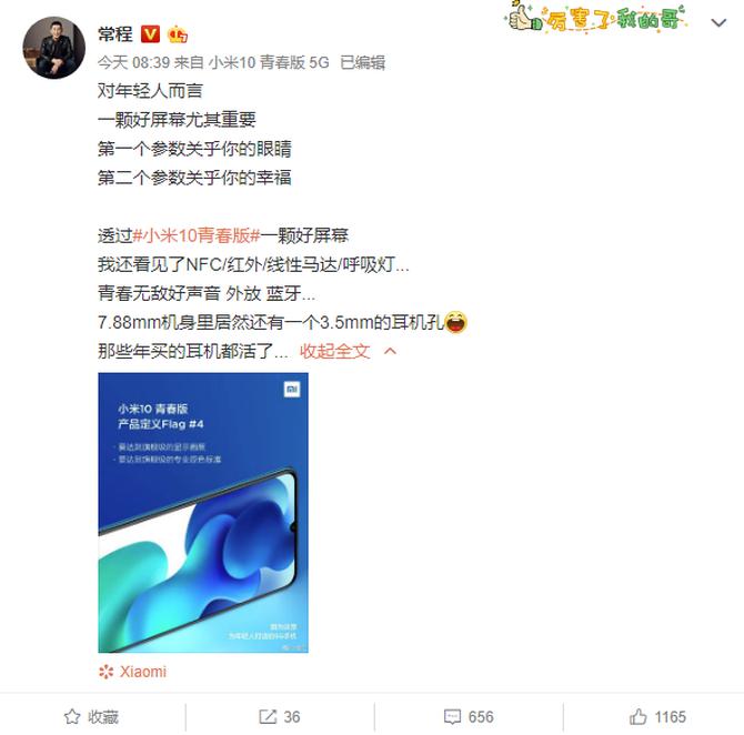 4月25日,小米集团副总裁常程在微博对即将发布的小米10青春版进行预热,公布了新卖点——一块专业级屏幕。