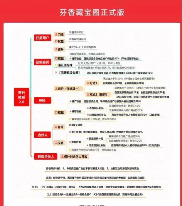 “芬香没有套路,一切参与都是免费,注册后朋友通过我们推广的优惠券买东西,我们还能拿到佣金。”芬香会员易天(化名)发来的资料显示,芬香晋升体系制度中,在超级会员之上,还有导师、合伙人级别。每个级别拿到的推广收益比例都不相同,通过推广裂变发展下级,推广收益会逐渐递增。