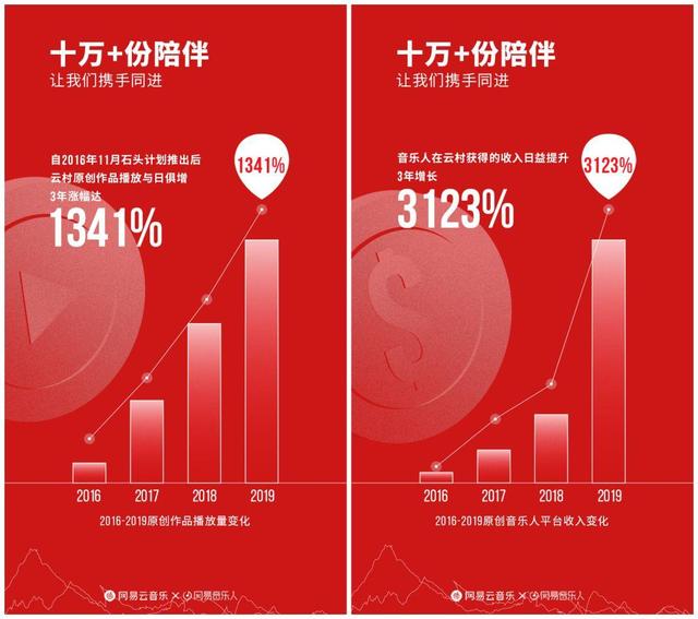 除了发布新举措外,网易云音乐也公布了不少重磅数据。比如去年12月宣布的:平台入驻原创音乐人总数超10万,音乐人上传原创作品数超150万首,3年来入驻原创音乐人总收入增长31倍,音乐人作品总播放量增长13倍。