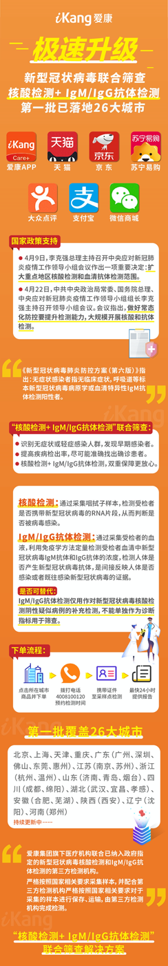 4月23日,爱康集团极速升级,在爱康APP、天猫、京东、苏宁易购、支付宝、微信商城、大众点评等多个线上平台升级推出“核酸检测+ IgM/IgG抗体检测”联合筛查解决方案,双重保障助力打赢抗疫“下半场”。