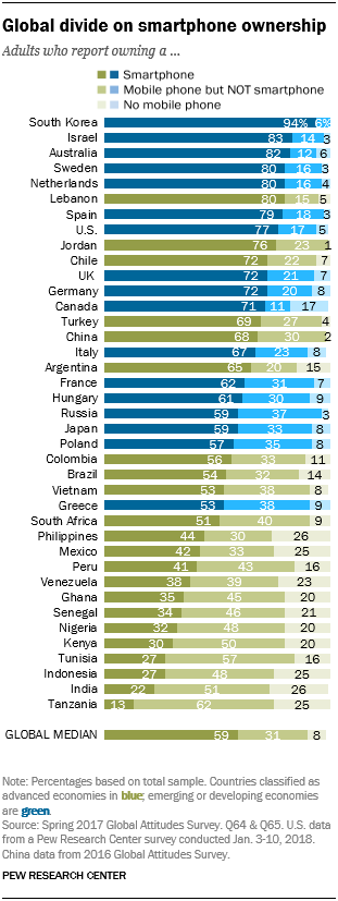 “螳螂财经”清楚,并不是每个人都能使用非现金支付。根据CNNIC发布的第44次《中国互联网络发展状况统计报告》,截至2019年6月,我国互联网普及率达到61.2%,其中,网民使用手机上网比率达到99.1%。假定所有能上网的手机均为智能手机,由此推断,我国智能手机持有比例约为60.6%。而根据美国皮尤公司(Pew Research Center)2018年的数据,中国智能手机持有率为68%。无论如何,仍有30%-40%的人群目前无法使用智能手机上网。