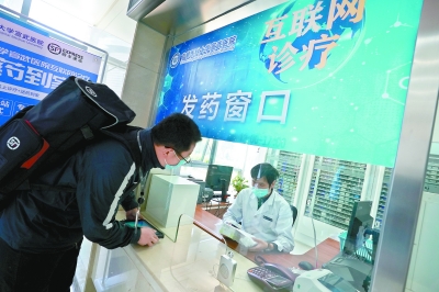 在宣武医院互联网诊疗发药窗口,配送人员为患者收取经药师审核后的配送药品。本报记者 方非摄 |