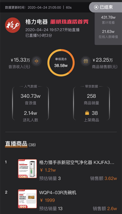 最尴尬的还是销售额,新抖后台数据显示,董明珠直播首秀当晚累计观看431万,在线人数峰值21.63万,商品销售额22.53万元,销售额最高的商品是新冠空气净化器,预计销售3台共3.62万元。作为对比,罗永浩同一天的直播累计观看896万,音浪收入170.49万元。商品销售额2792.65万元,销量最高的是吸尘器,销售额为521.55万元。