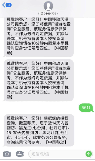 在赵先生表示自己没有去过牡丹江市之后,社区工作人员告诉他,行程卡具有权威性。“你可以自己查询漫游所在地,也可以给中国移动的客服打电话。”然而赵先生在手机上“通信行程卡”小程序中查询的漫游所在地与给移动发短信收到的答案一样。在他提供给红星新闻记者的截图中都显示“您于14天内到达或途径:黑龙江省牡丹江市、七台河市”。