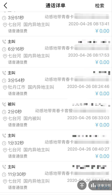 4月26日,赵先生在中国移动APP上查询了自己的通话详单。其提供的截图显示,赵先生在4月25日11时到17时之间,曾在七台河市、牡丹江市两个不同的地点拨打电话,而这段时间他一直在七台河市新兴区。