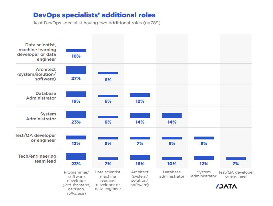如下图所示,针对 DevOps 专家来说,多数人拥有不止一个角色。可以看到这些开发人员如何描述自己角色重叠的属性。DevOps 专家中有 23%既是程序员又是系统管理员,而 27%是程序员和架构师。拥有一定开发能力前提下,对如何管理和设计系统有一定的理解,是在未来能够引领 DevOps 发展方向的重要组合。