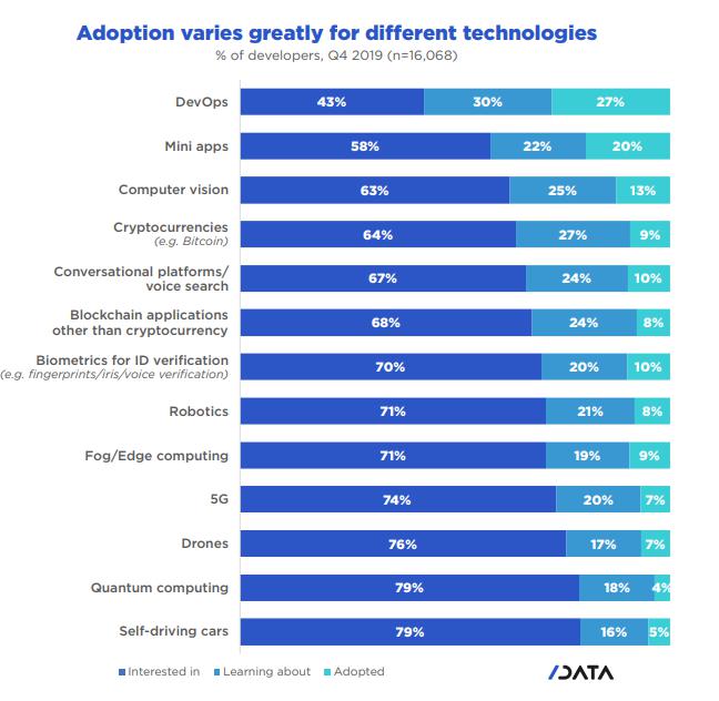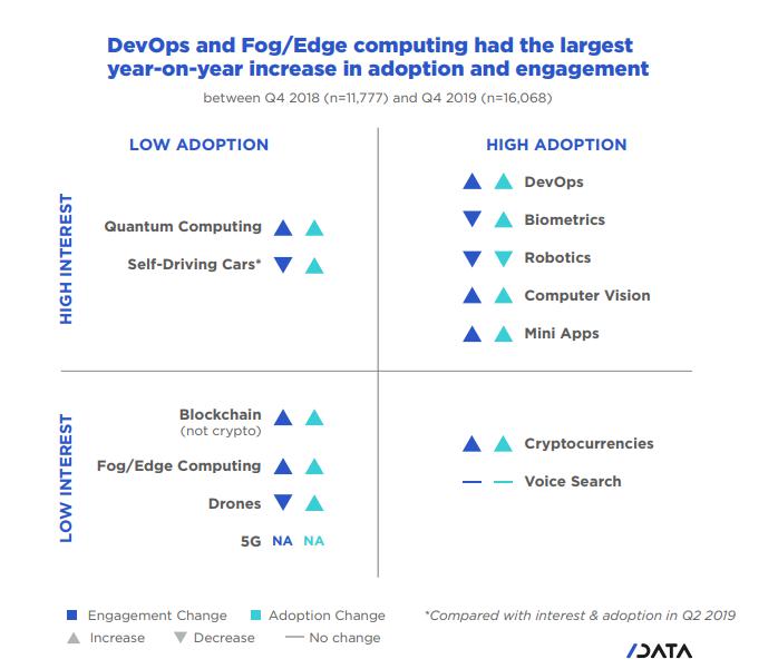 DevOps 以及雾/边缘计算(fog/edge computing)在接受度和参与度两方面实现了最大的年同比增长。