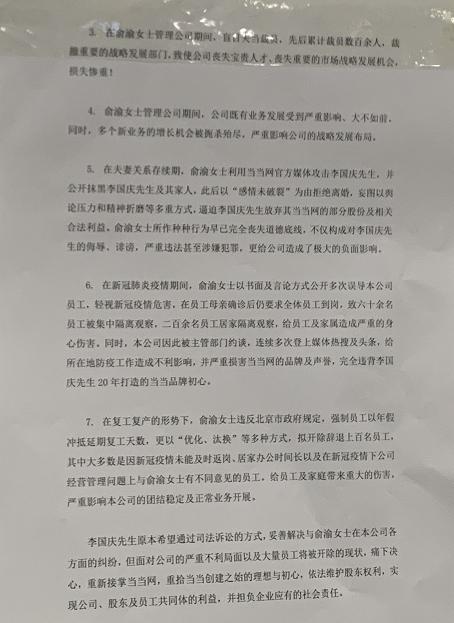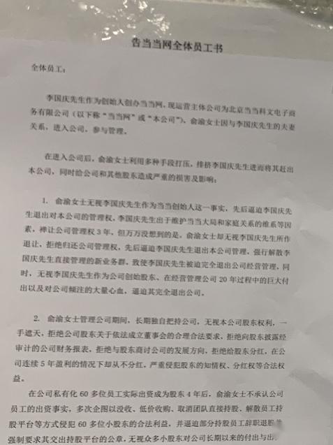 李国庆还在当当张贴了一张“告当当网全体员工书”。除了例举俞渝种种“不当行为”,更重要的是宣布: