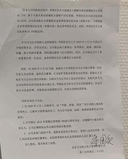 李国庆已经于4月24日依法召开临时股东会,作出决议:公司成立董事会,由李国庆、俞渝、陈立等担任董事,选举李国庆为董事长与总经理。并自4月24日俞渝不再担任当当执行董事、法人、总经理,选举其为董事。