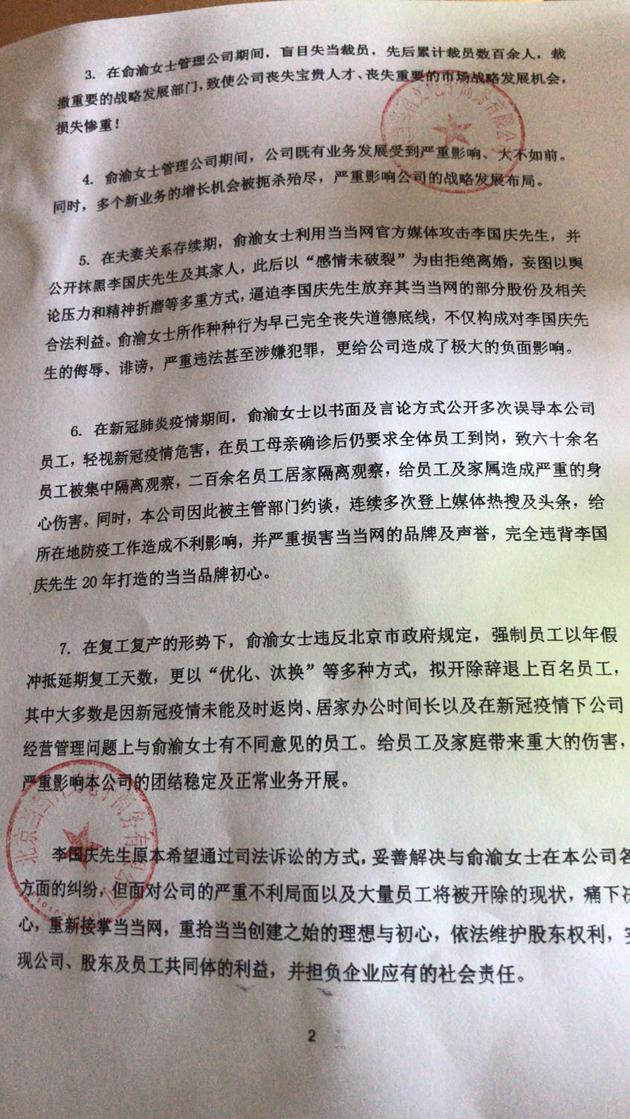 李国庆在“告知书”中表示,俞渝在经营管理当当网期间,无视股东权益、拒绝向股东分红,严重侵犯股东的知情权、分红权等合法权益。不仅如此,在新冠疫情防控期间,俞渝轻视某员工家属确诊新冠肺炎的事实,要求全员到岗,导致公司六十余名员工被集中隔离观察,二百余名员工居家隔离观察。公司也因此被主管部门约谈,公司名誉受到严重影响。