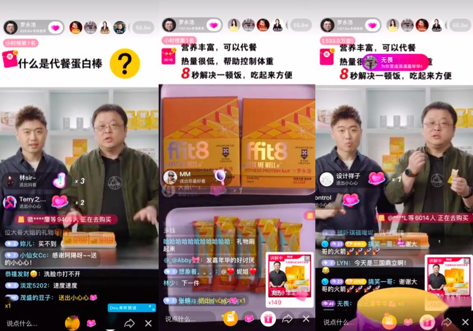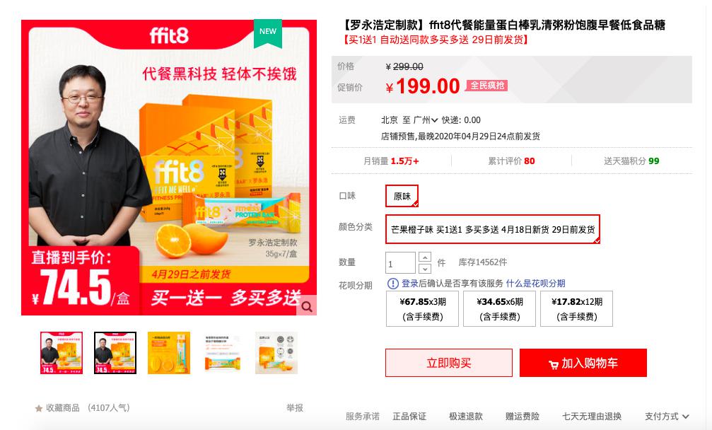 4月24日,老罗在直播中推出了ffit8轻体代餐蛋白棒,这是老罗第一次推荐代餐产品,在直播间,老罗对ffit8轻体代餐蛋白棒进行科普后试吃点赞,这款宣称“兼顾口感、便利和营养”的轻体控糖代餐产品也推出了罗永浩定制款。在很多人看来老罗应该带不动这款相对比较前卫的食品——钟薛高成为老罗首场直播的爆款因为雪糕大家都知道,轻体代餐蛋白棒则不然,不过最终数据却让人意外:截至4月25日12:00售出超过4.5万盒,337万销售额。