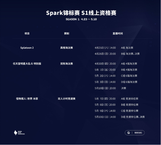 Spark 锦标赛比赛项目包括《Splatoon2》、《任天堂明星大乱斗 特别版》以及《怪物猎人 世界:冰原》,各项目优胜者将获得丰厚的奖励。