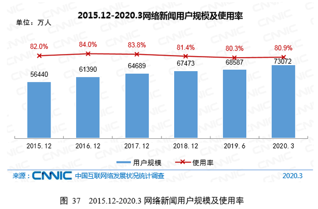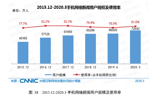 截至2020年3月,我国网络新闻用户规模达7.31亿,较2018年底增加5598万,占网民整体的80.9%;手机网络新闻用户规模达7.26亿,较2018年底增加7356万,占手机网民的81.0%。