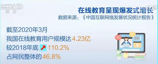 《报告》显示,截至3月,我国在线教育用户规模达4.23亿,较2018年底增长110.2%,占网民整体的46.8%。2020年初,全国大中小学校推迟开学,2.65亿在校生普遍转向线上课程,用户需求得到充分释放,在线教育应用呈现爆发式增长态势。
