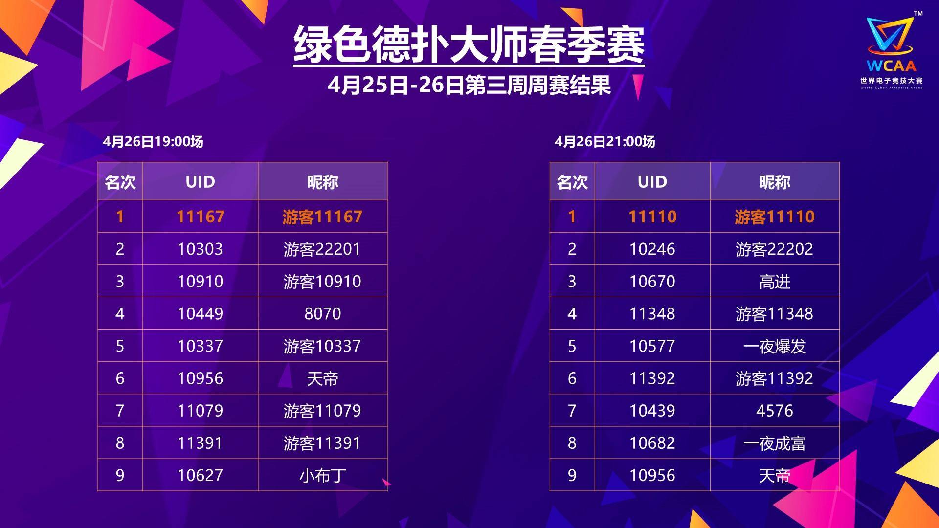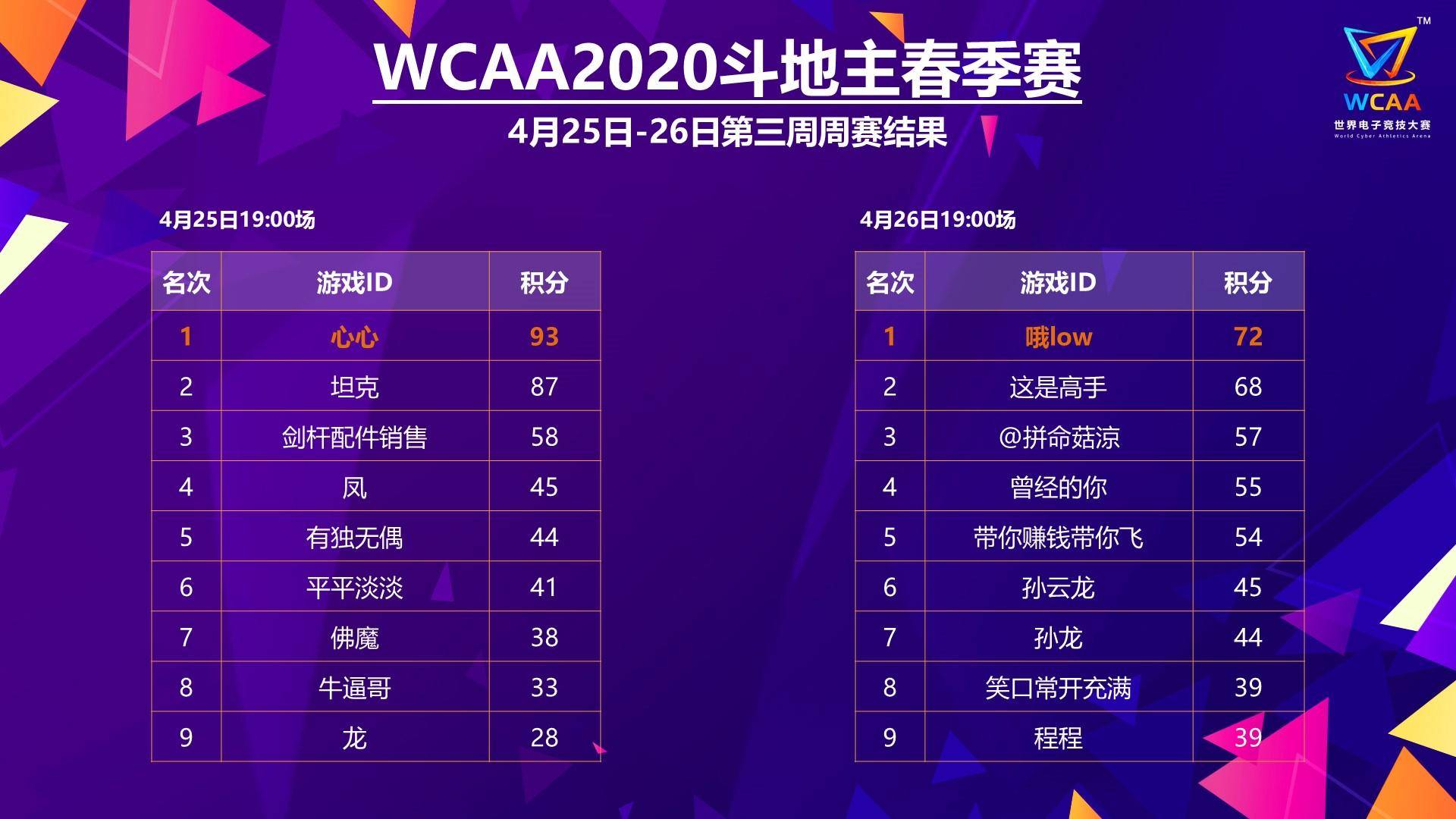 WCAA2020斗地主春季赛每周末进行2场比赛,冠军选手将获得1000元现金奖励,除此之外还收获25WCAA大师分及春季赛决赛门票一张;亚军将收获500元现金奖励及18WCAA大师分;季军将收获200元现金奖励及15WCAA大师分。目前WCAA2020斗地主春季赛已经进行了三周比赛,共产生了6位冠军获得者晋级总决赛。