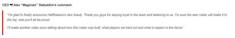"我很高兴终于可以宣布HellRaisers的新阵容了,感谢选手们对团队的忠诚和信任。我敢肯定,新名单将会打出很好的成绩,并且让每一位选手感到骄傲,我将很快发布新的信息,讨论目前战队的组建方式、我们尝试过的选手以及对未来的期望。"