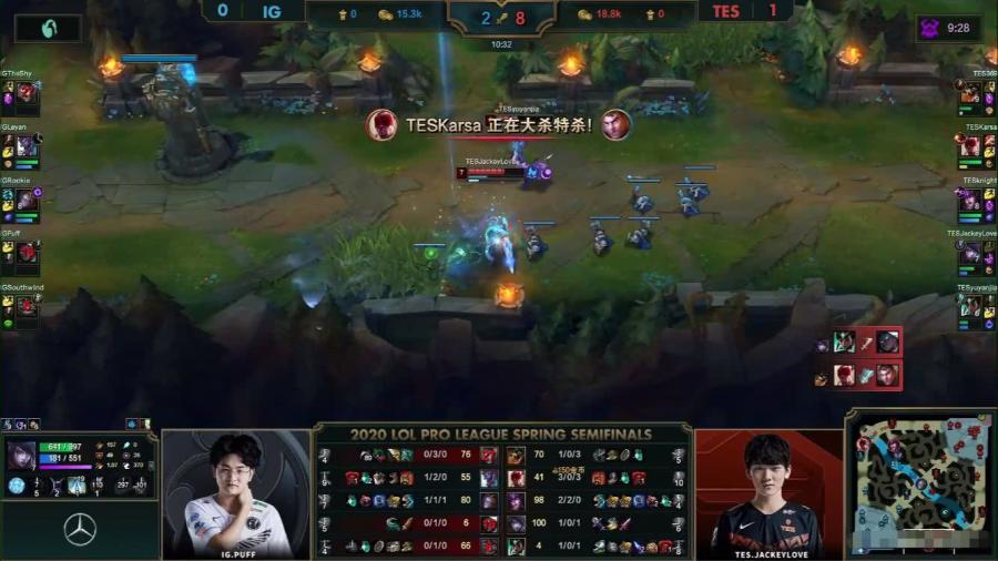 虽然IG尝试抓了一波JKL,而且强杀了厄斐琉斯,但是Karsa盲僧上路已经带着峡谷先锋推掉上二塔了,Theshy开局非常强势的杰斯被369反压兵线,镜头一转,JKL推掉下路一塔,这是对线期的优势,18分钟karsa一个RQ配合鳄鱼的W直接击杀Theshy,TES拿下先锋。