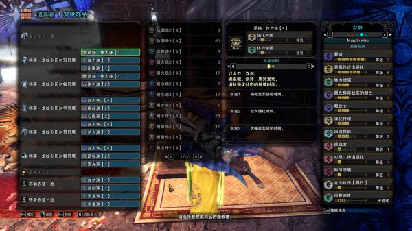 无论是无脑零解流还是正常打法都可以用的万金油配装,有刚刃保证斩味,适合用来打打凶爪,如果无脑零解推荐把一个昂扬体力珠换成防音体力,因为斩斧零解自带四级耳塞。