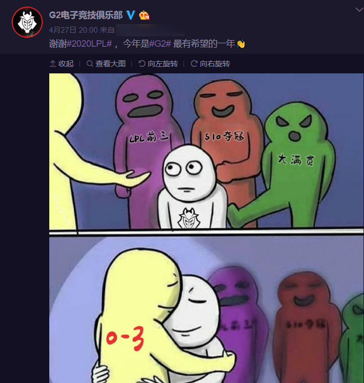在S8世界赛的时候,G2虽然成功击败了RNG,但随后半决赛却被IG零封。而S9世界赛就更过分了,好不容易才打进了总决赛,却被FPX直接零封,离大满贯的梦想仅一步之遥。这个赛季虽然世界赛还没有开始,而且MSI季中赛也取消了,但G2看到IG和FPX两大世界冠军,在LPL都只能打季军赛,估计心里也是很慌。