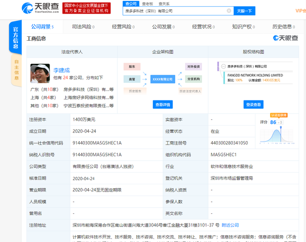 4月28日下午消息,天眼查信息显示,4月24日,房多多科技(深圳)有限公司成立,法定代表人为房多多联合创始人兼CTO李建成,注册资本1400万美元。该公司经营范围包括计算机软件技术开发、信息技术咨询、信息系统集成、计算机软硬件及辅助设备批发等业务。