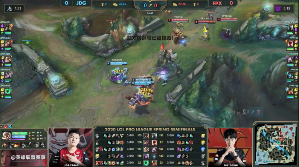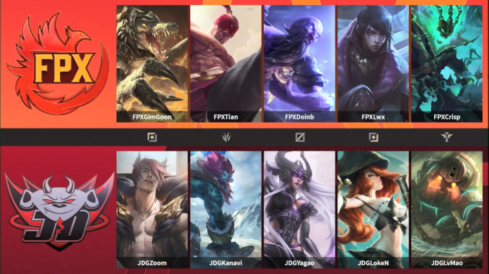 接下来的两场比赛,JDG延续了他们的BP思路,封锁Doinb的英雄池,针对贡子哥做战术安排,给上流的zoom公爵一个很大的发挥空间。第二局的比赛FPX也是拿到了自己非常擅长的阵容,Doinb在前一场bo5发挥非常优秀的瑞兹,以及能够帮助贡子哥对线舒服的大鳄鱼。LWX更是选到了目前T0的AD厄斐琉斯,单从阵容来看,FPX这一套是他们非常熟悉的阵容,刘青松的锤石开团,上中野都有点控,只要战术能得到执行,那么FPX经典四包二就会让JDG尝到厉害。