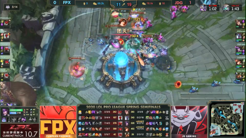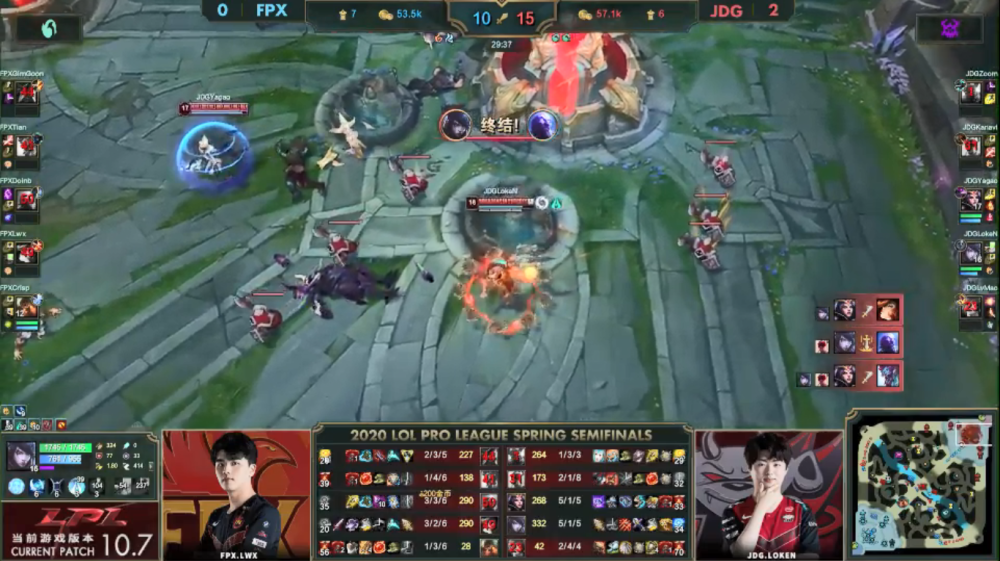 后面牙膏又在高地进行了一波个人秀,丝血一打四反杀巨魔还成功逃生。不愧是上流社会的代言人之一诡术妖姬。28分钟时,FPX抓住了一个非常难得的机会,刘青松人群之中勾到loken,成功开启团战并且团灭JDG。就在观众都以为FPX要一波结束比赛,扳回一城的时候,由于比赛才进行到三十分钟,loken率先复活,靠着折镜的超远攻击距离,一人防守住了FPX四人的拆塔攻势,随后牙膏复活收获双杀,FPX再无力回天。