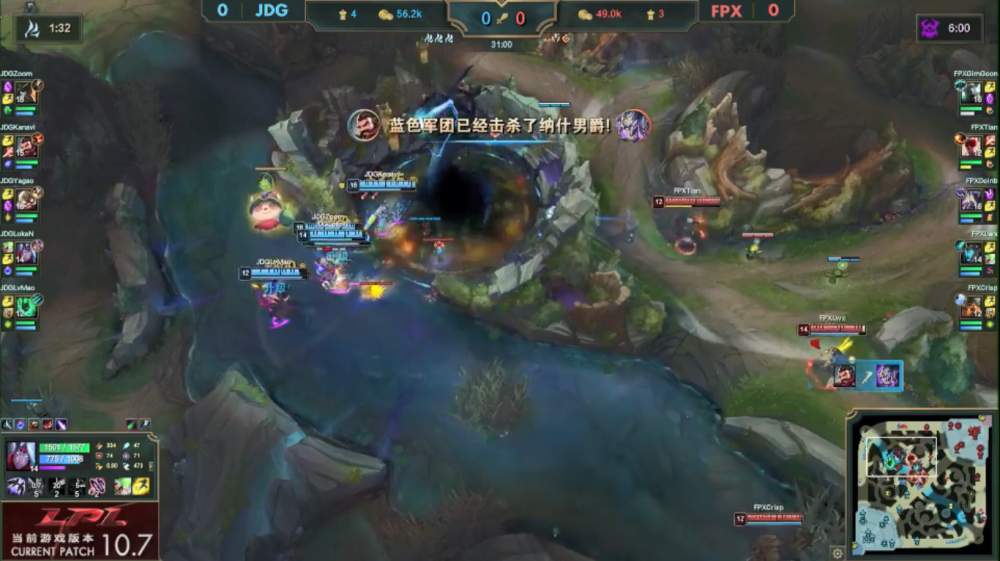 大家都知道选择卡萨丁的队伍,肯定会在比赛前期劣势一些,往往难以控到小龙。然而FPX却通过小天的个人发挥成功的控到了前期的两条小龙,与之相对的是男枪控下了第一条先锋并且顺利拿下下路一塔。仅仅是这样,其实对于FPX是非常能接受的,接下来的FPX只要守住中路一塔,让卡萨丁去下路没有一塔的长线去发育,那么通过放小龙让卡萨丁可以成长到正面接团的程度,那么FPX的赢面就很大。可是没想到JDG的决策如此的出色,他们中下野四个远程英雄,乘着对方中野回家的时机,直接抱团中路逼走FPX双人路,直接把没有了镀层的中路外塔拔掉。这样一来,JDG的主动权就非常的大的,不仅仅扩大了经济差距,同时还压缩了FPX的视野。这也直接导致了30分钟的时候JDG直接rush大龙,FPX反应不及时只能让JDG逃之夭夭。