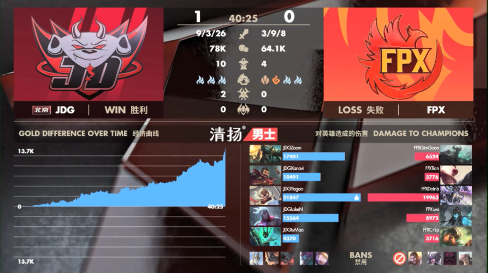 虽然这个时候卡萨丁已经16级三件套,可是对面的四个输出位置,男枪、飞机、维鲁斯全都有了三件半的装备,一直发育良好的船长更是恐怖,已经是戴上了三级头拥有了四件装备。之后的比赛时间里面,FPX虽然也找机会跟JDG打了几波团战,但是由于对面的四核阵容输出太强,卡萨丁一进场就会被融化,所以即便是FPX拿到了风龙魂,却没能阻挡JDG带着大龙BUFF的下路推进,一波结束比赛。