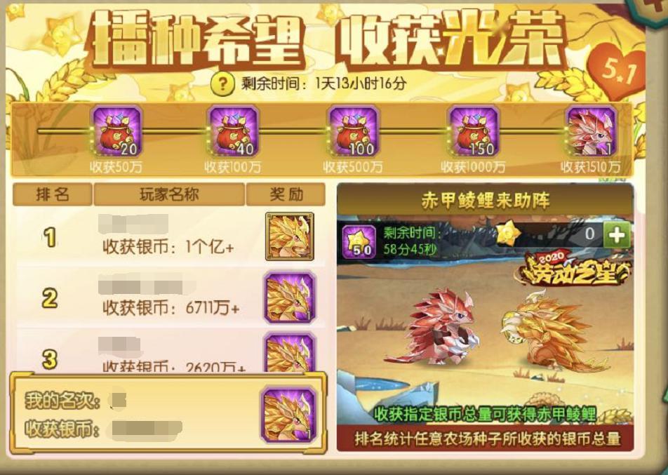 5、 种子成熟后收获银币总数达成指定目标即可领取阶段奖励,最终大奖为农场新宠物赤甲鲮鲤。