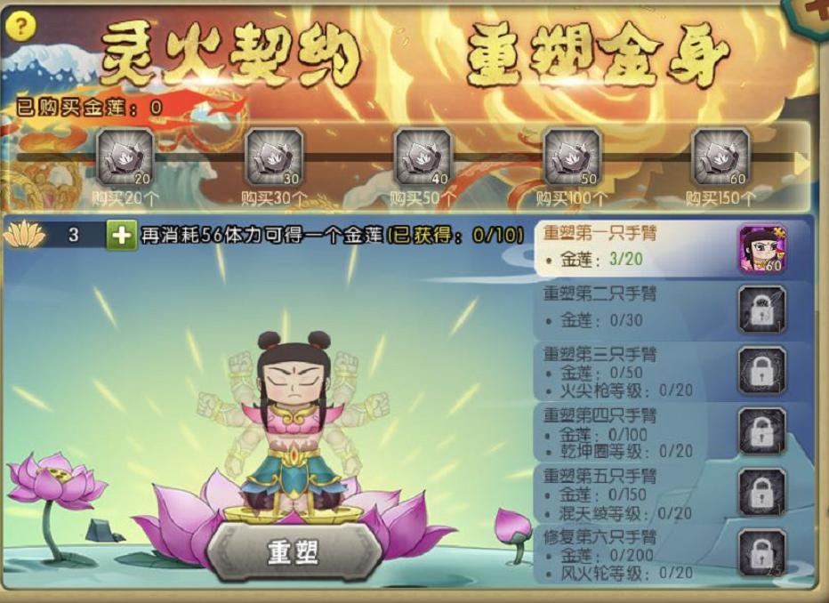 3、 重塑手臂需要消耗大量金莲,每次重塑手臂后可获得奖励。