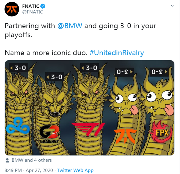 原标题:FNC推特自嘲 FPX也躺枪:与BMW合作的战队都是3:0
