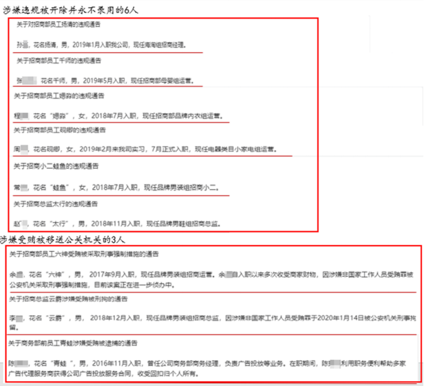 ▲今年3月6日,拼多多商家后台同步了招商小二云蔚涉嫌收受商家贿赂被检察院批准逮捕,招商经理六神多次收受商家贿赂被公安机关采取刑事强制措施的公告。