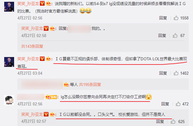 笑笑的意思很明确,就是告诉网友们IG觉得是个好俱乐部,王校长对自家选手的待遇极好,即使自己退役了他还打工资自己,所以所谓“黑心老板”的言论都是错误的。不止如此,笑笑在评论下面还表IG算最不正规的俱乐部,体制很奇怪,以前都没有合同,纯属口头义气,王校长爱玩游戏,但不是商人!笑笑的简单几句话就知道IG当时的情况,王校长只是把他们几个人组合起来打比赛,并不是单纯把他们当成商业发展。