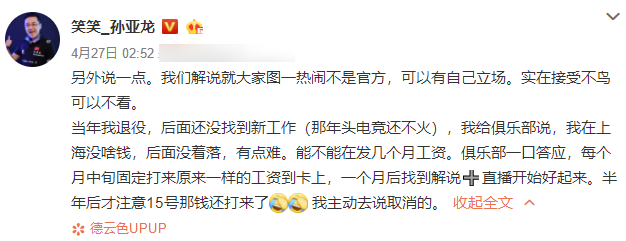 下面就是的笑笑的说辞,他表示当年退役后电竞还不火,自己还找不到工资,于是就先给IG俱乐部谈了谈看能不能发几个月工资,王校长一口答应,之后半年IG都还给他发工资!