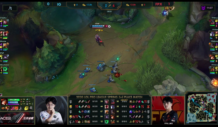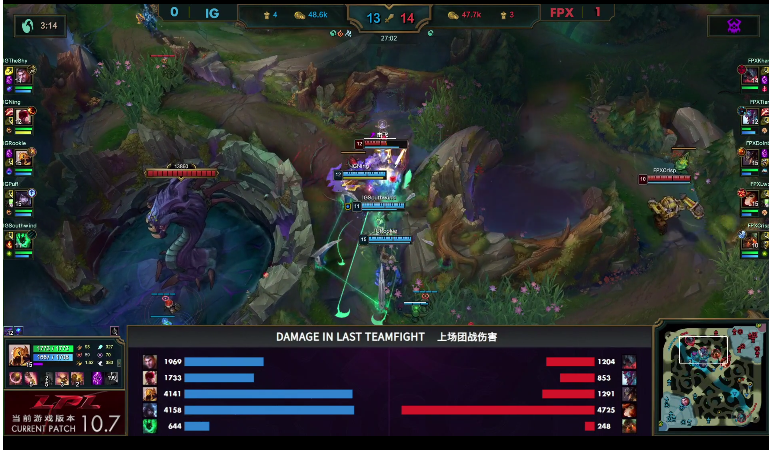 [13:19] IG在上半河道依靠盲僧的闪现加大招以及Q技能,立即补上火力,成功反打FPX,拿下敌方上野两人。接着,IG上路一塔告破,而盲僧一人是控下火龙,但杰斯在上半河道被FPX集火斩杀,峡谷先锋也是让FPX夺下。