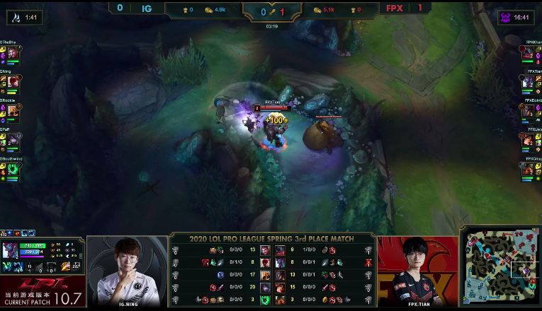 [20:15] 双方在蓝色方下半野区爆发战斗,卡牌在落地后,被迫交出金身。之后,IG三核输出爆炸,FPX瞬间交代四人。接着,FPX想要阻止IG打大龙,并且成功干扰。