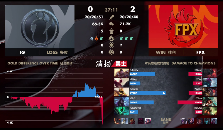 [35:42] 锤石率先在小龙处倒地交代。接着,巨魔在队友的掩护下惩戒夺下水龙。之后,FPX带着兵线开始推进。随后,泰坦在下路Q技能控到厄斐琉斯,FPX立即集火击杀掉敌方三C。最后,FPX直接杀进IG基地,获得第二局比赛胜利。