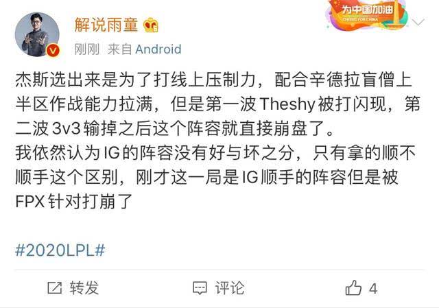 而雨童则是直言IG崩盘落败原因:“杰斯选出来是为了打线上压制力,配合辛德拉盲僧上半区作战能力拉满,但是第一波Theshy被打闪现,第二波3v3输掉之后这个阵容就直接崩盘了。我依然认为IG的阵容没有好与坏之分,只有拿的顺不顺手这个区别,刚才这一局是IG顺手的阵容但是被FPX针对打崩了!”