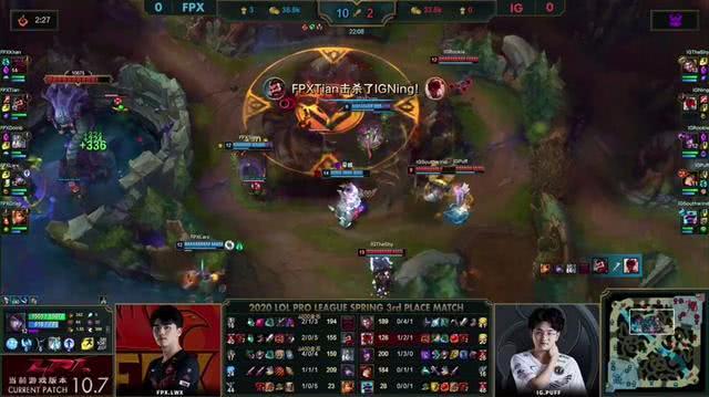 22分钟,FPX利用视野偷龙逼团,宁王没视野要去看龙率先被秒,打出一波0换3,而后火龙魂争夺战,双方中路拉扯,Theshy杰斯走位太靠前又率先被秒,IG被迫依旧选择接团,但阵容以及装备差距太大,遭到一波团灭,Lwx拿下三杀,FPX直接拿下火龙魂以及大龙,经济领先到一万,基本胜券在握!