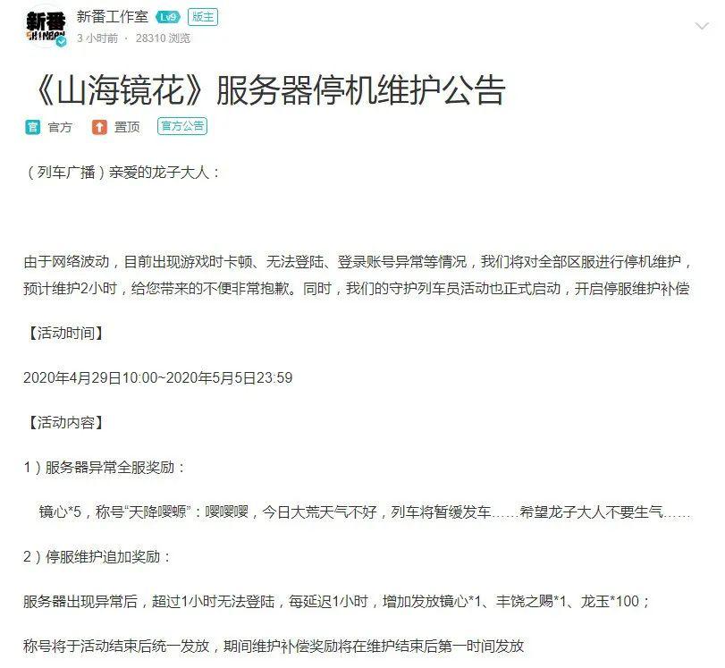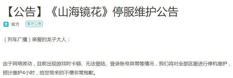 然而,《山海镜花》的开局并不顺利。中午12点左右,官方宣布「因网络波动,需停机维护2小时」,并表示将赠送5枚镜心,每延迟1小时加赠1枚。(1枚镜心可抽卡1次)