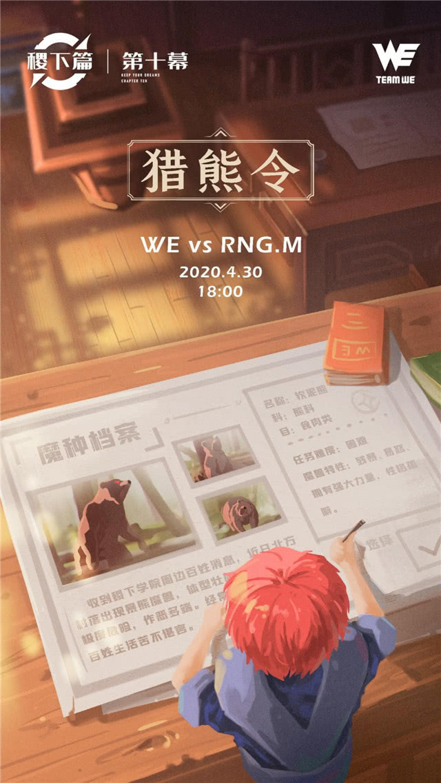 WE赛前海报“猎熊令”,身在稷下学院的WE企图对“魔种”软泥熊发起猎杀计划,WE今日能否成功猎杀软泥熊呢?