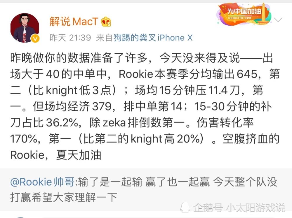 作为一直以来IG最稳定的carry点,rookie用自己的行动证明了“你永远可以相信宋义金”,即使完美发挥,由于整体状态上的不佳,IG被零封,赛后“心疼rookie”登上微博热搜,显然输掉比赛的rookie有点不敢相信这一切,面色凝重,之后LPL解说mact还专门公布了数据来证明“谁才是LPL第一中单”,甚至用空腹挤血来评价rookie。