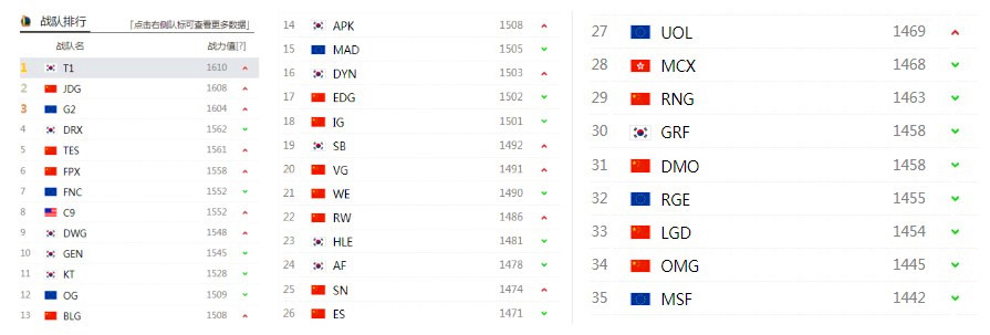 不过说到这个全球各个战队的战力值,其实我们LPL赛区目前并不能拿到最高的位置。根据(基于胜负预期同结果间差距,通过国际排行算法计算得出。)现在LCK的T1战队是以1610分,占据全球榜第一的位置。而我们LpL唯一能与之抗衡的队伍只有JDG战队1608,只要JDG能战胜TES战队,JDG就能拿下世界第一的强队的位置。