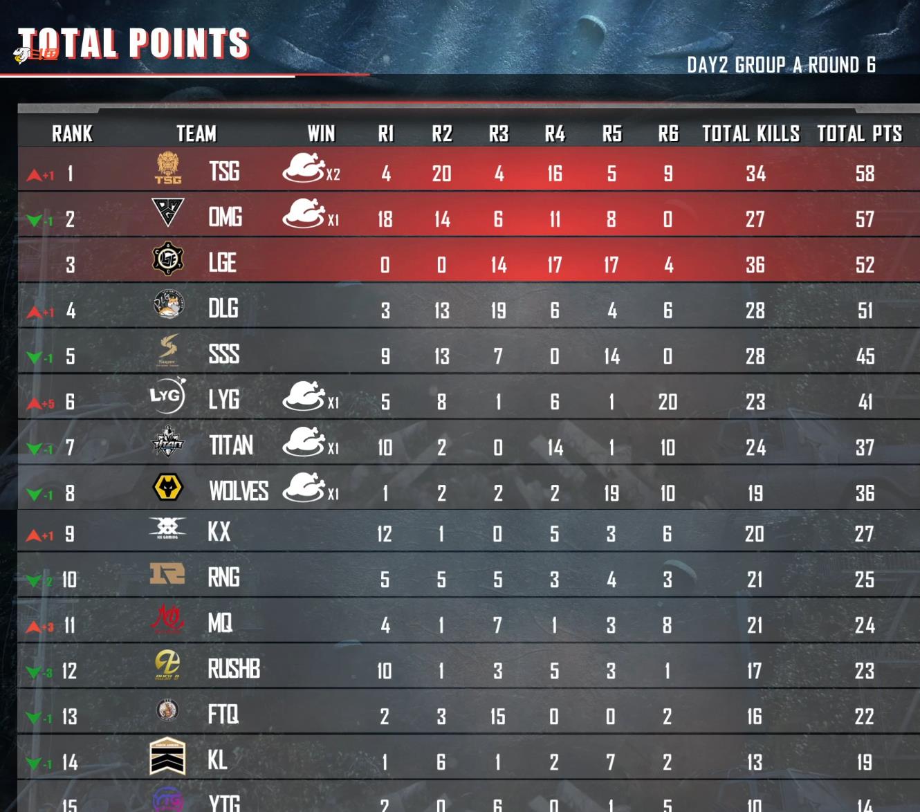 首先来看看今天的总积分榜,在PCL春季赛淘汰赛失利的TSG战队今天凭借着两鸡成功位居今天积分榜榜首,TSG战队可以说和天霸战队一样是小组赛之王了,不知道TSG战队什么时候能和天霸战队一样突破这个魔咒夺得属于自己的冠军。