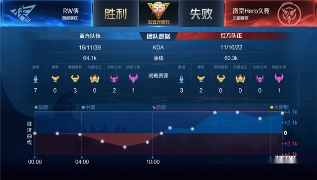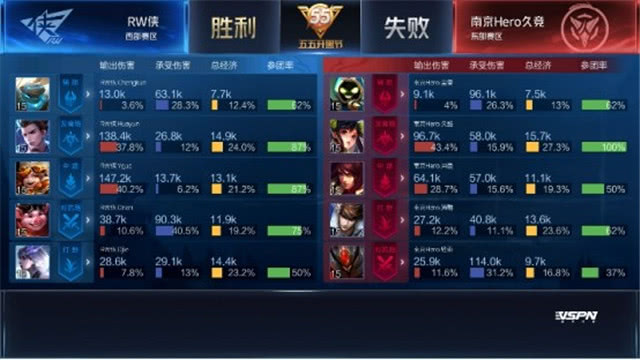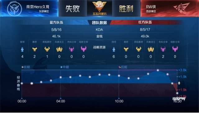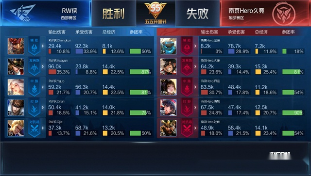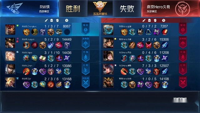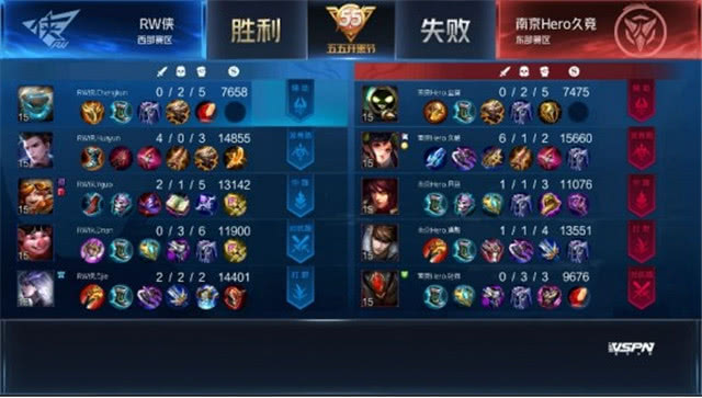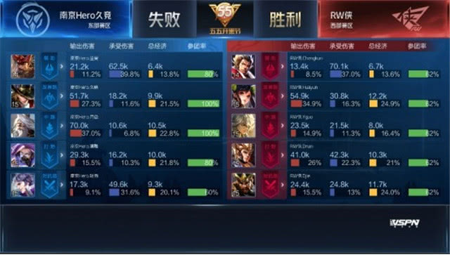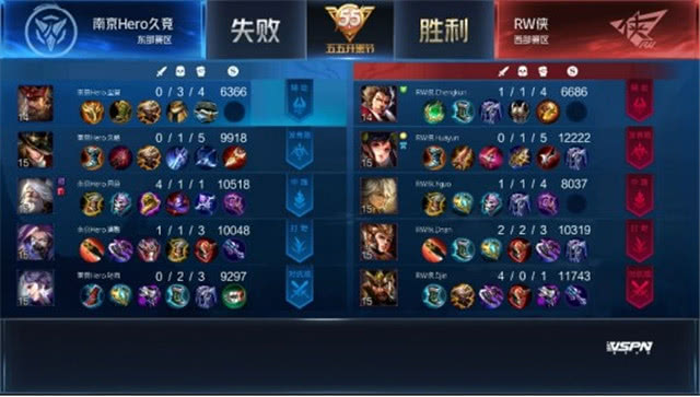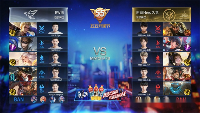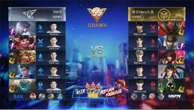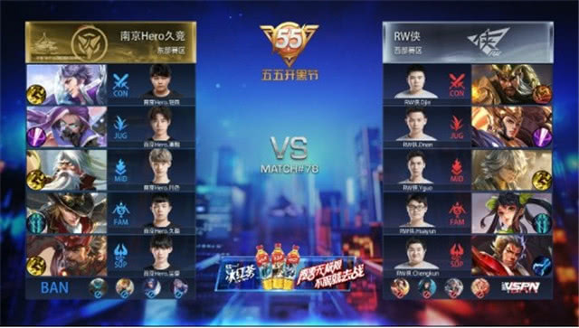开局RW侠入侵南京Hero蓝区,南京Hero孙尚香击杀盾山拿下一血。2分14秒RW侠击杀先知主宰,4分16秒RW侠拿下暴君。5分15秒RW侠拆掉南京Hero中下路一塔,南京Hero击杀猪八戒。7分30秒RW侠进攻南京Hero下路二塔被击杀两人,8分02秒南京Hero拆掉RW侠下路一塔。10分59秒RW侠击杀黑暗暴君,12分01秒RW侠拆掉南京Hero上路二塔并击杀白起。12分37秒RW侠击杀主宰,13分40秒南京Hero击杀镜。13分58秒南京Hero击杀盾山,15分30秒RW侠拿下黑暗暴君并击杀白起。19分30秒团战RW侠打出2换5团灭南京Hero,RW侠带领中路兵线一波拆掉水晶拿下比赛胜利。